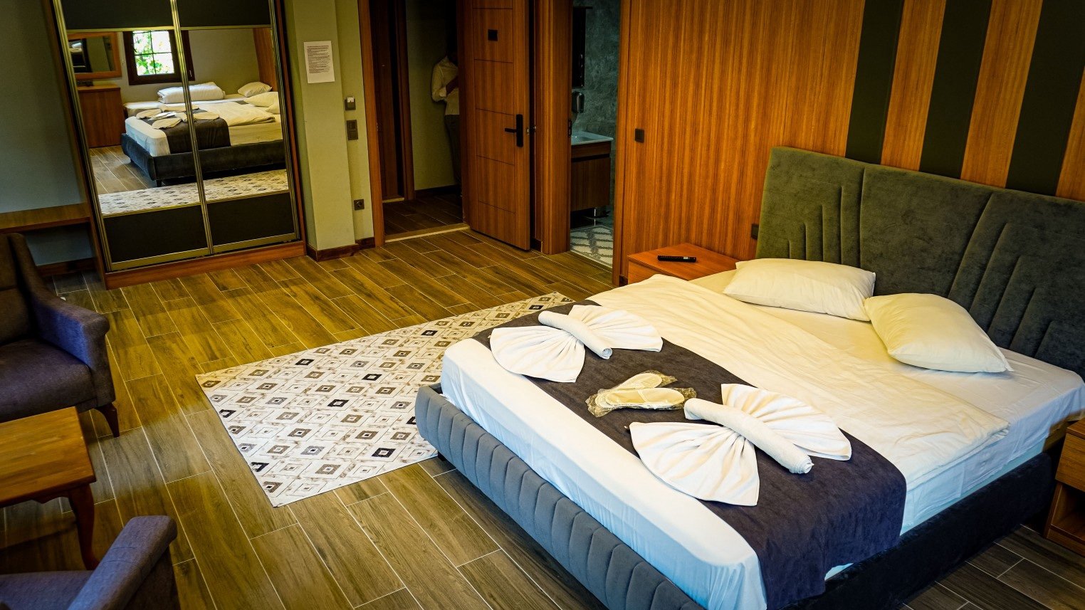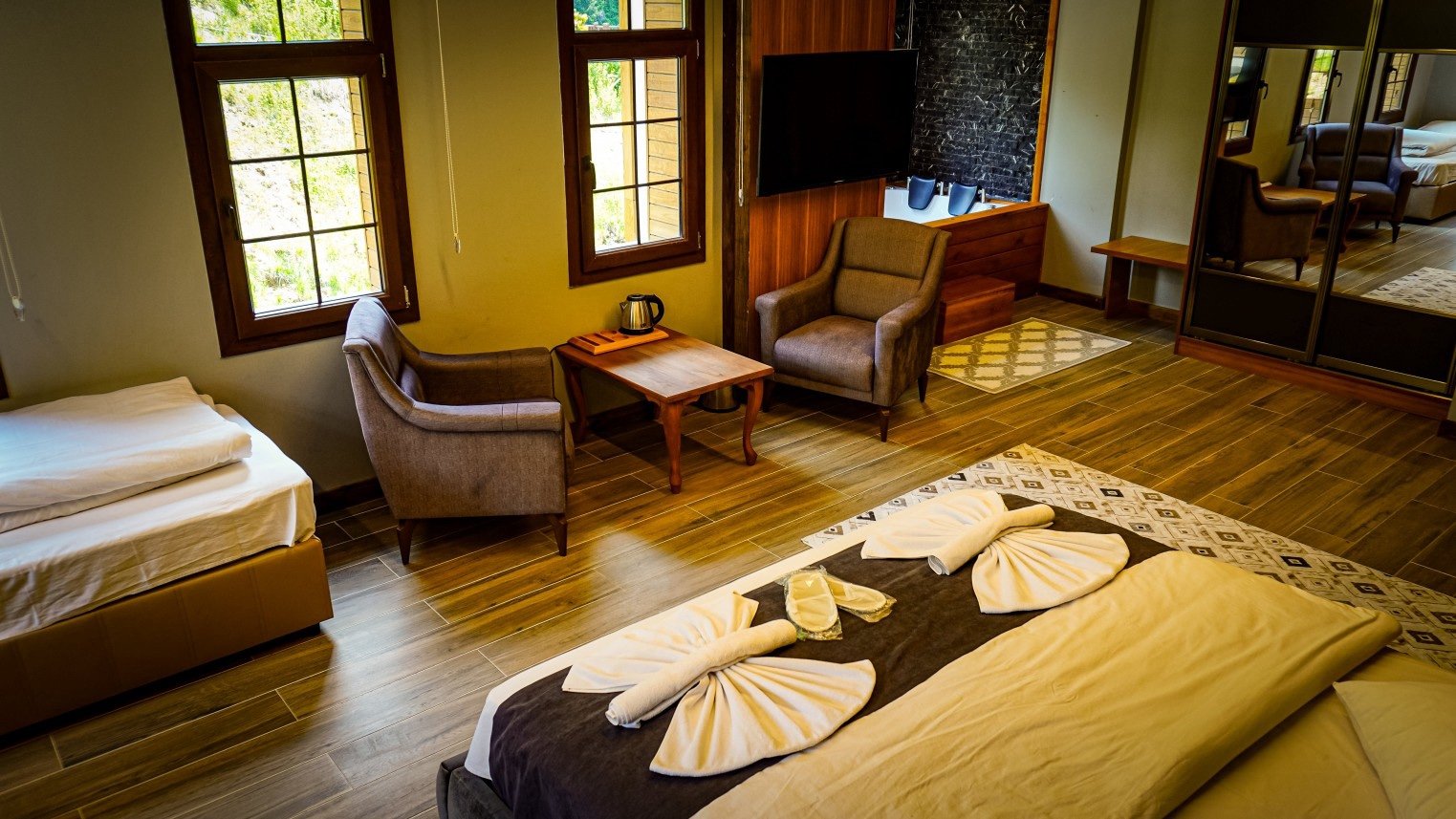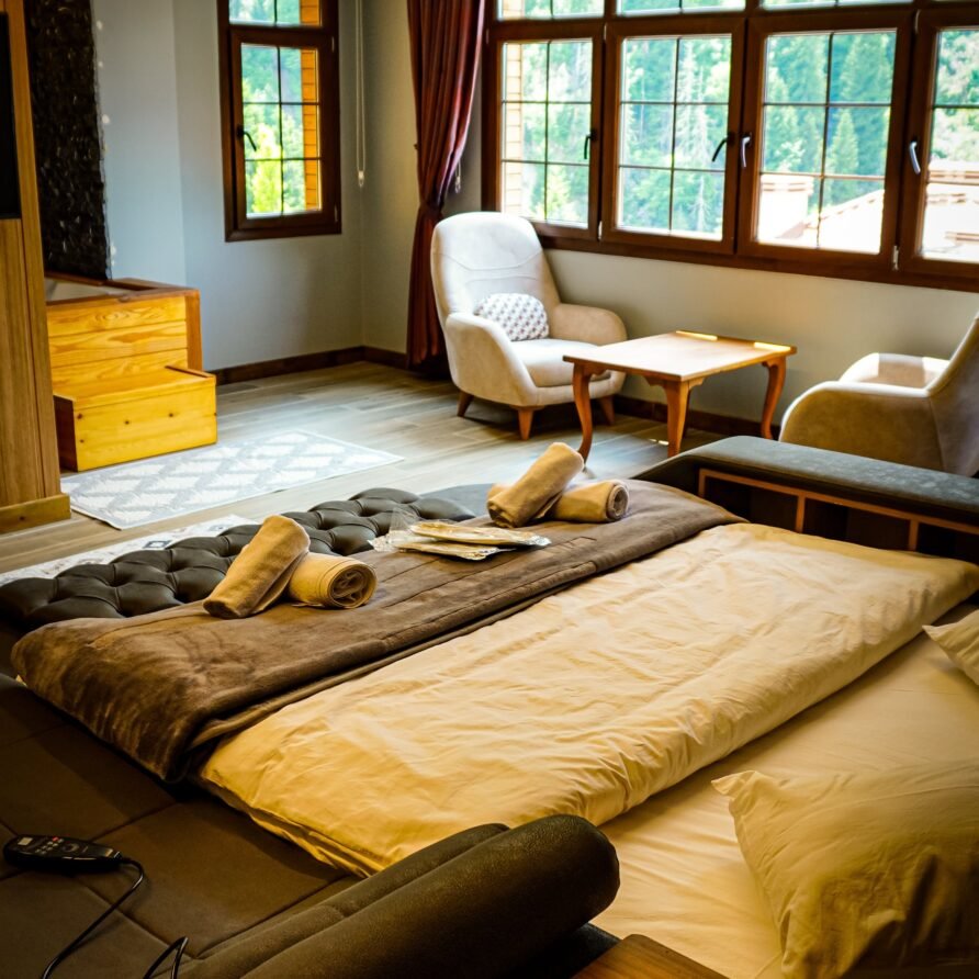 Each suite is outfitted with modern amenities including an LCD TV, high-speed Metro Ethernet internet, telephone, refrigerator, electric stove, kettle, washing machine, dining table, full-length mirror, and a seating area for relaxation. Thermal water is available throughout the suite, including in underfloor heating, ensuring a warm and comfortable stay. Breakfast and dinner are included, and additional services such as massage can be arranged to enhance your family’s luxurious experience. With ample space, private balconies, and thoughtful design, our Deluxe Family Suites offer the perfect home-away-from-home for an unforgettable vacation.