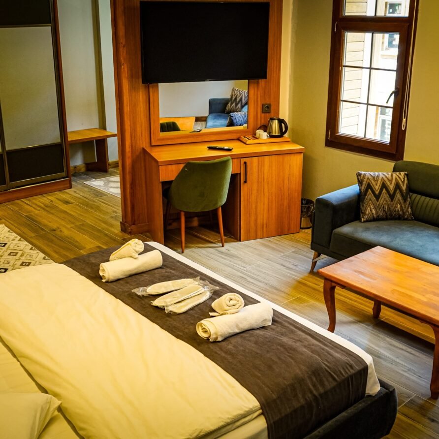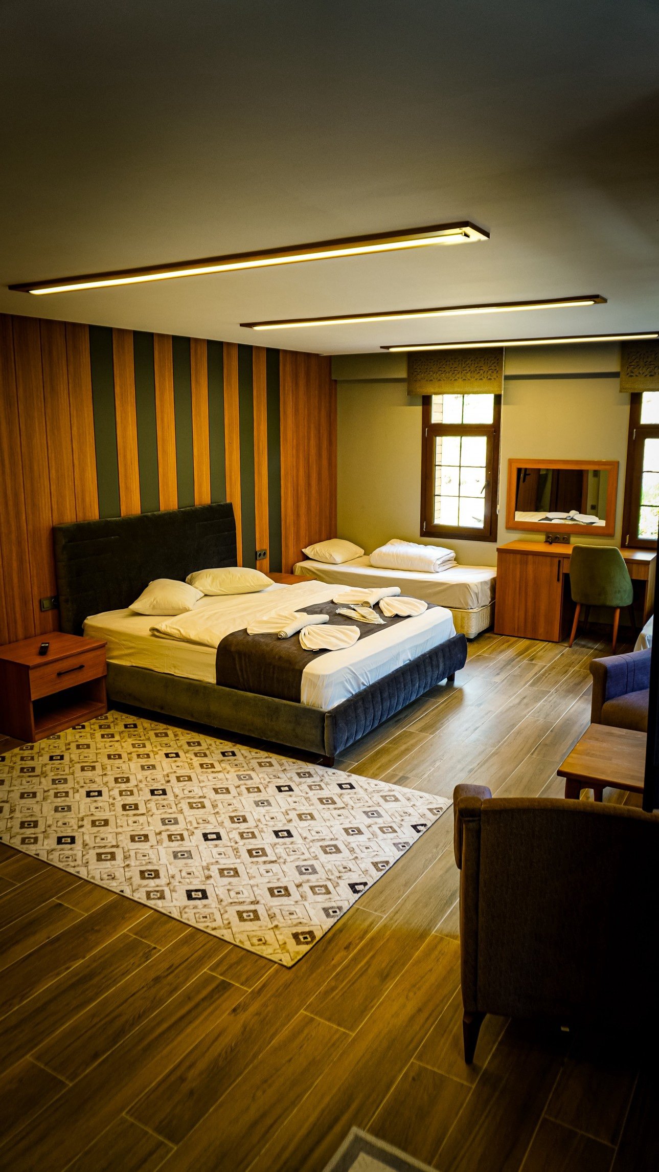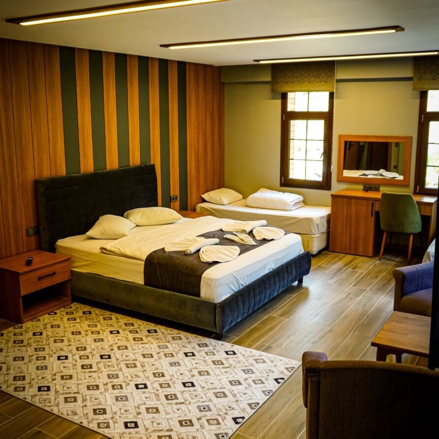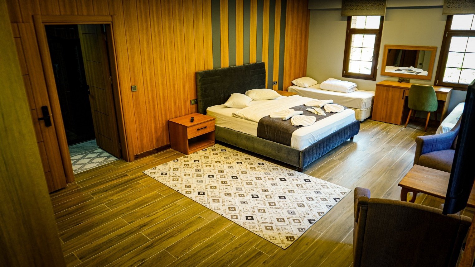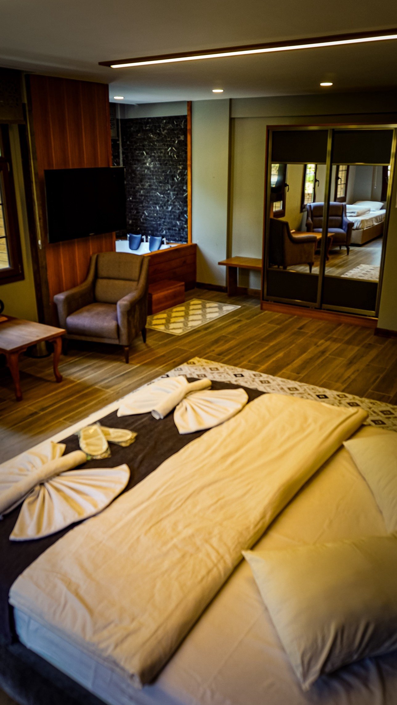 Our Deluxe Family Suites are thoughtfully designed to provide maximum comfort for families seeking both relaxation and convenience. Featuring a master bedroom with a king-sized bed and a separate bedroom with twin beds, these suites also include a spacious American-style living room with two comfortable sofa beds. Guests can enjoy a private jacuzzi, a luxurious marble bathroom, and a fully equipped kitchen for preparing meals at their convenience.