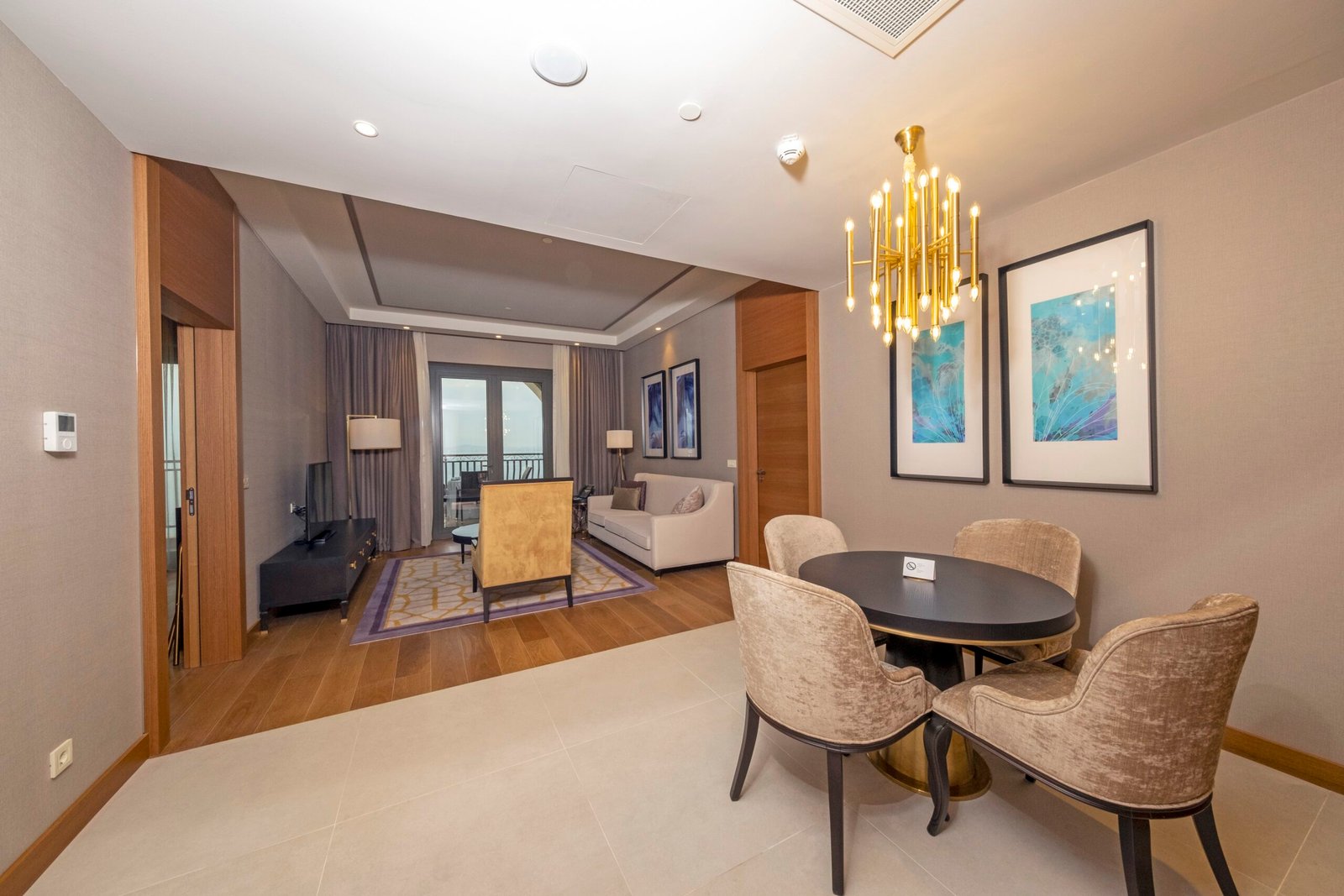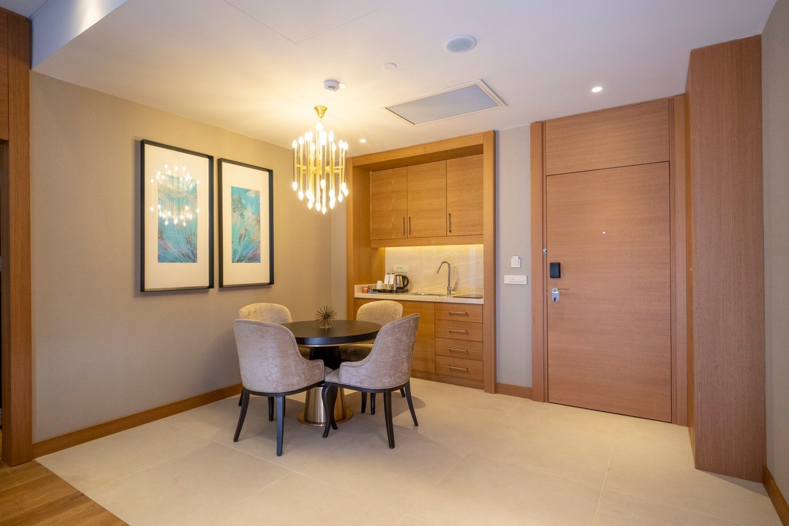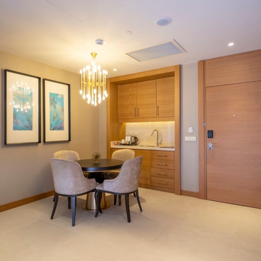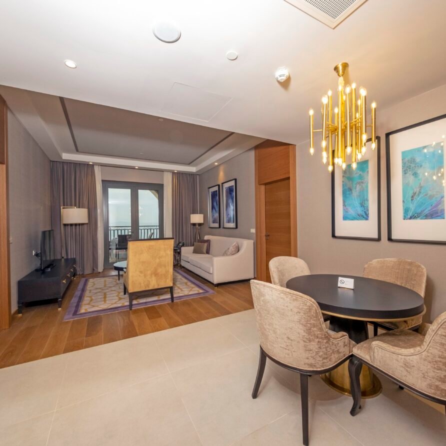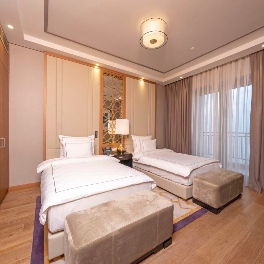 This family-friendly accommodation features a twin-bedroom and a king-bedroom, two separate bathrooms, a fully equipped kitchen, ample living and dining spaces, and a large balcony, providing the perfect setting for a comfortable and memorable family vacation.