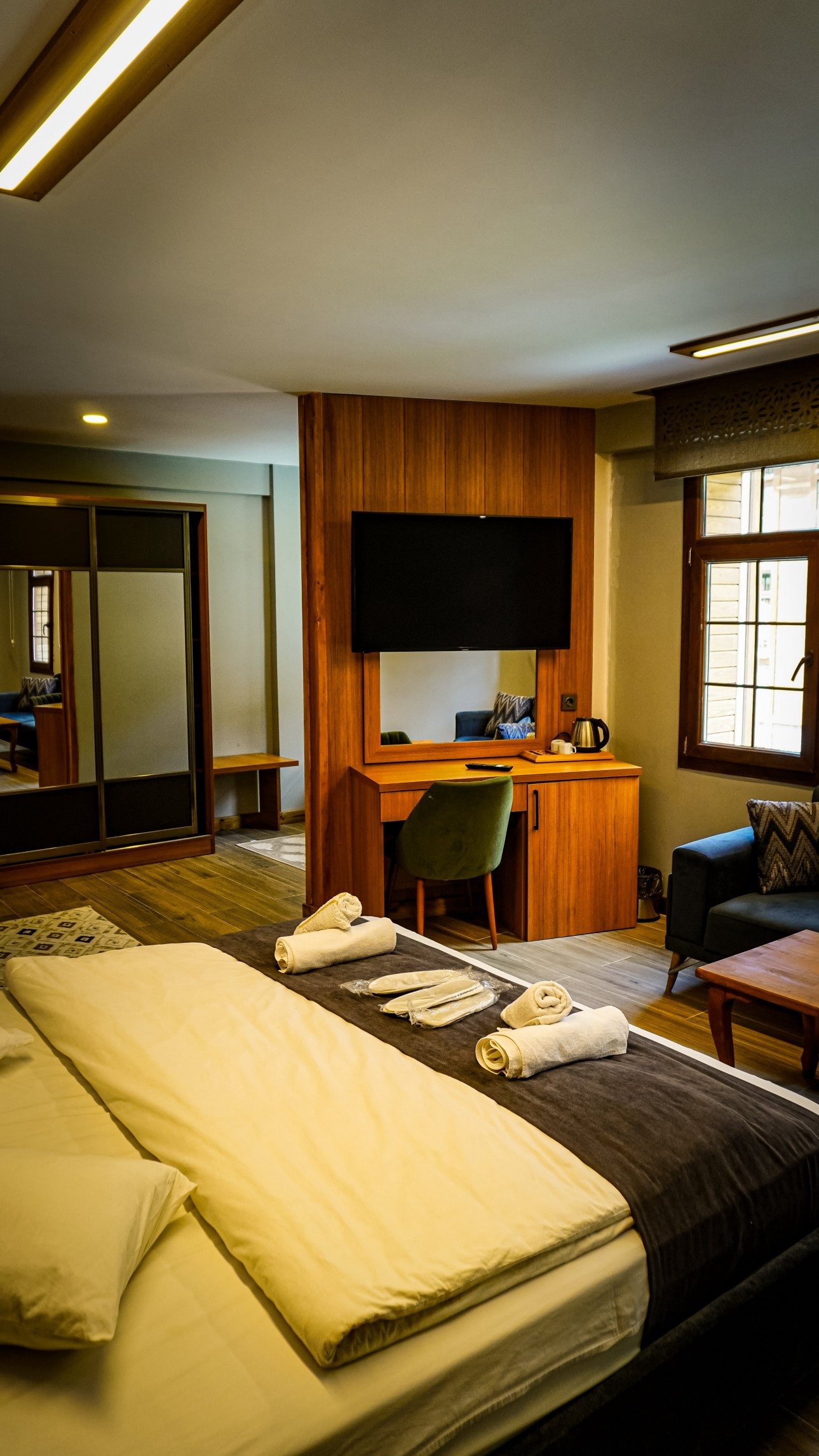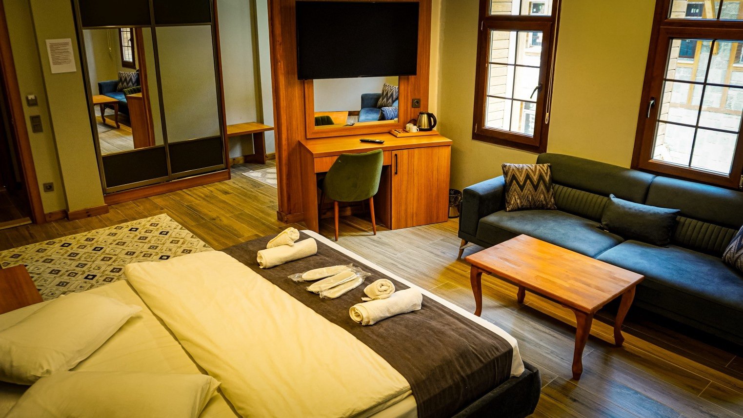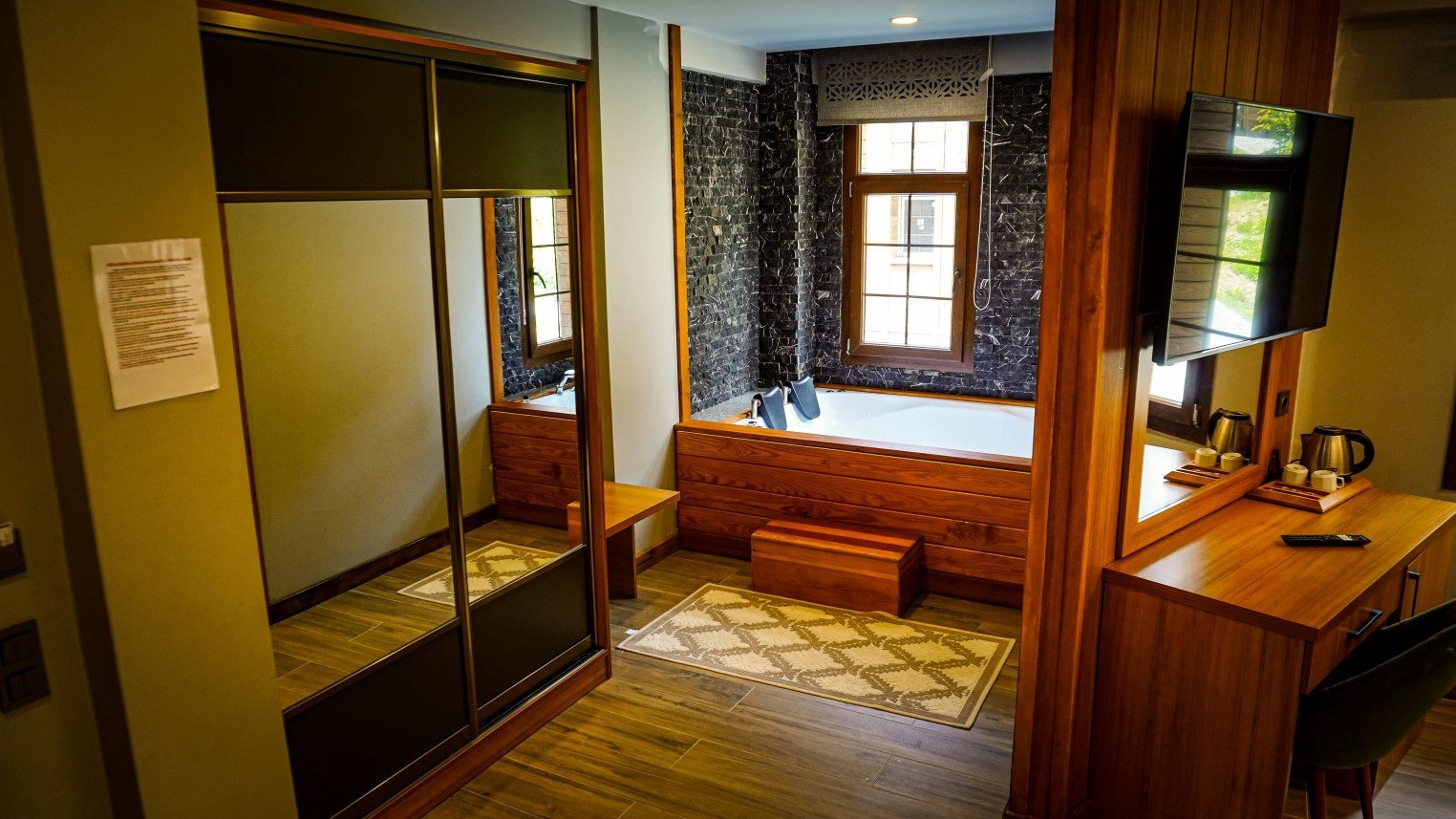 Modern amenities include an LCD TV, high-speed Metro Ethernet internet, telephone, refrigerator, electric stove, kettle, washing machine, full-length mirror, dining table, and a cozy seating area. Guests can unwind in a private jacuzzi or luxurious marble bathroom, while thermal water is available throughout the suite, including in underfloor heating for optimal comfort.