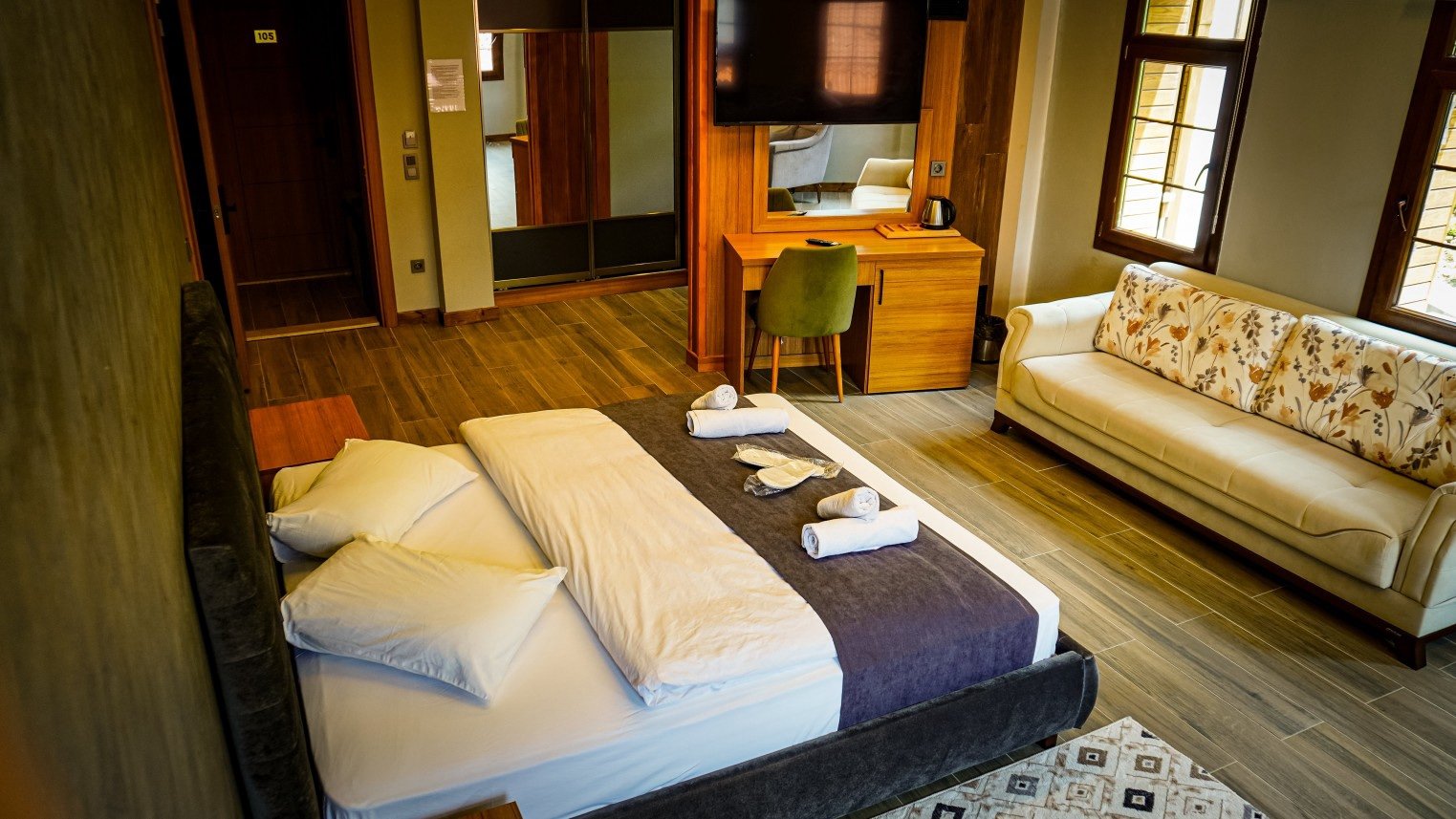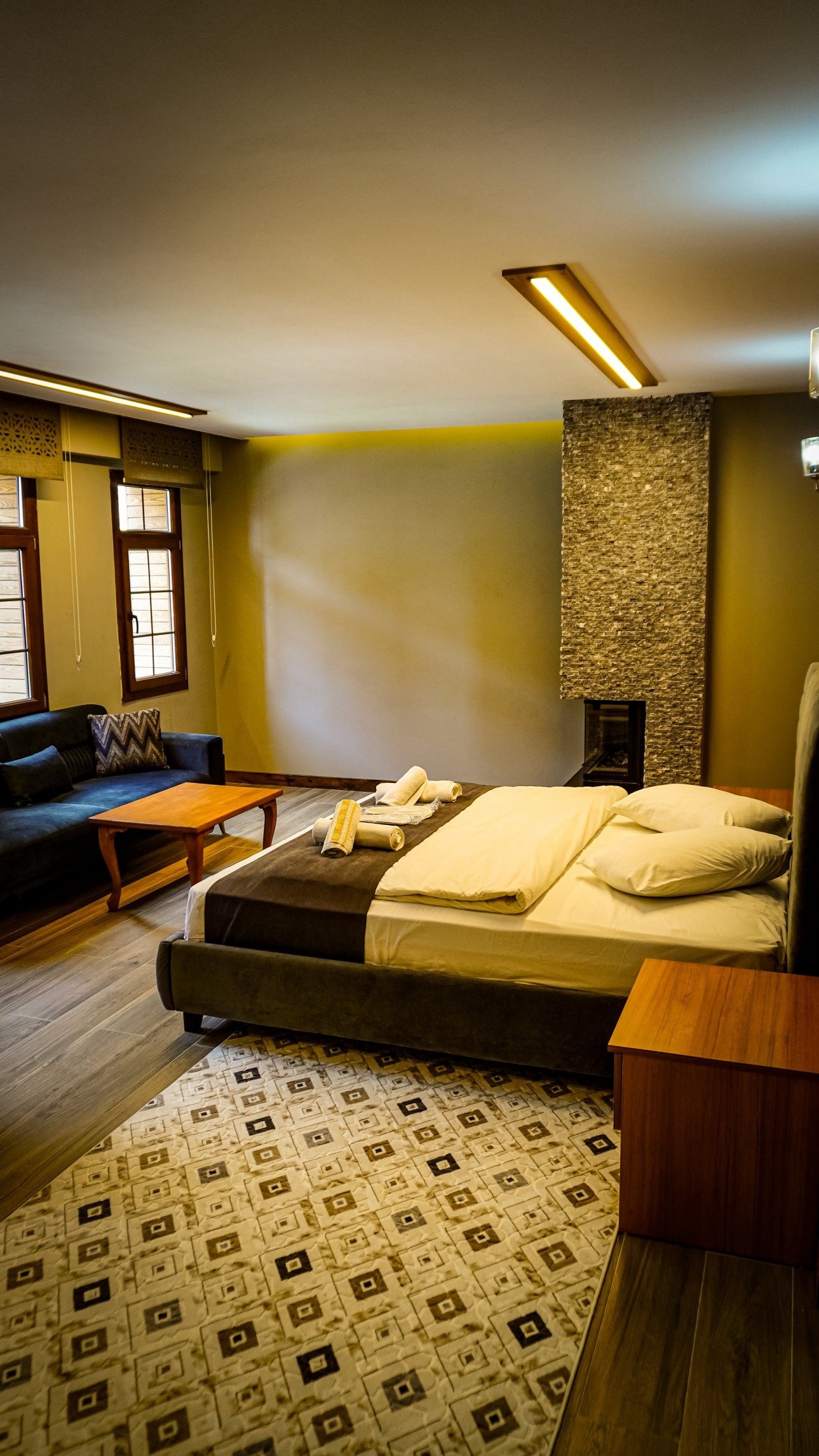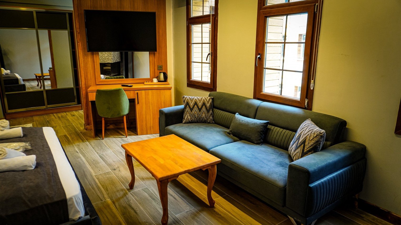 Modern amenities include an LCD TV, high-speed Metro Ethernet internet, telephone, refrigerator, electric stove, kettle, washing machine, full-length mirror, dining table, and a cozy seating area. Guests can unwind in a private jacuzzi or luxurious marble bathroom, while thermal water is available throughout the suite, including in underfloor heating for optimal comfort.