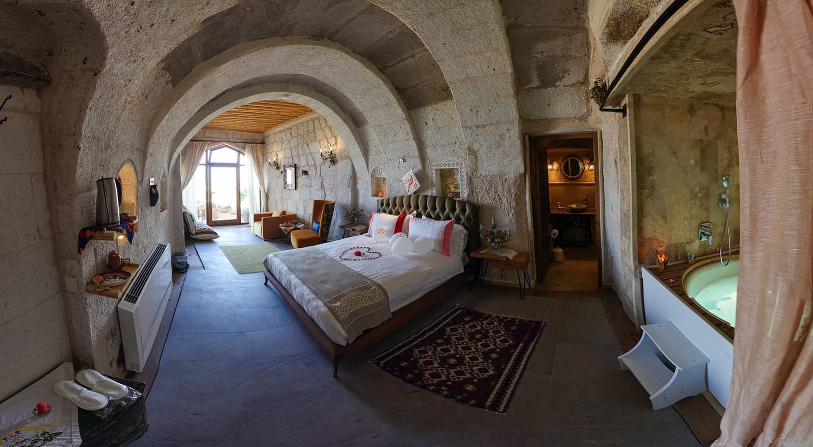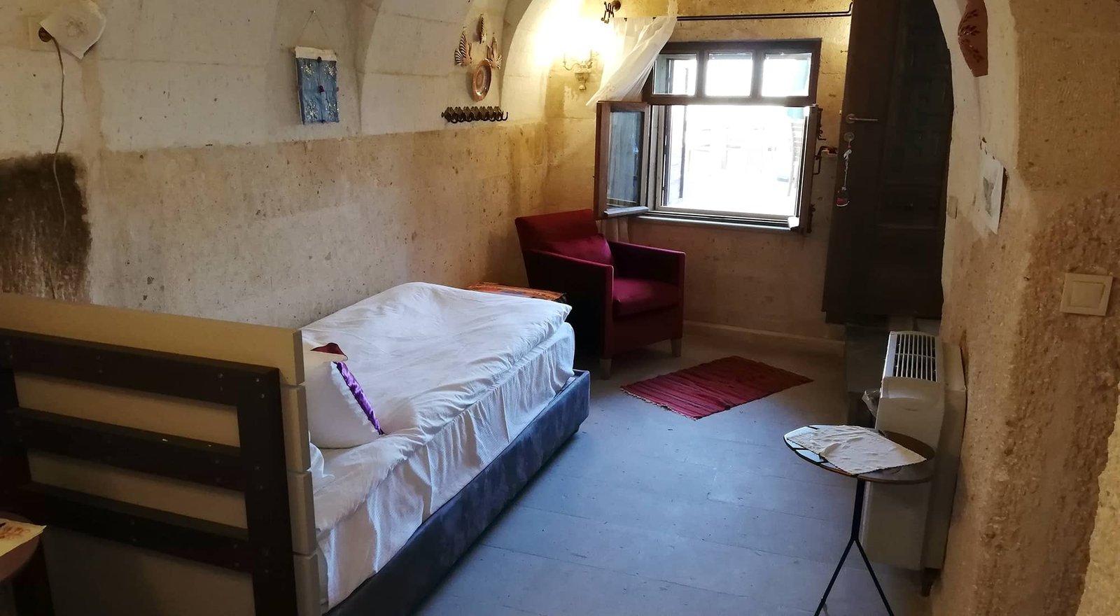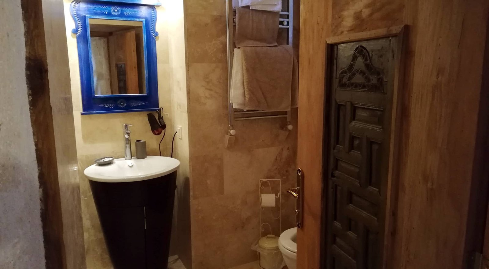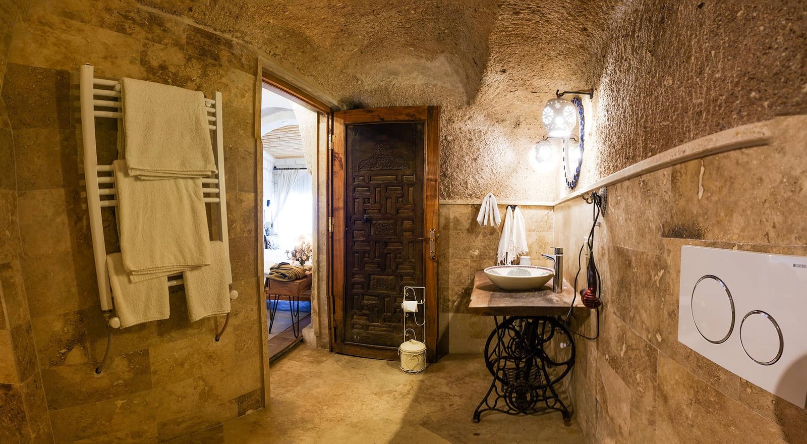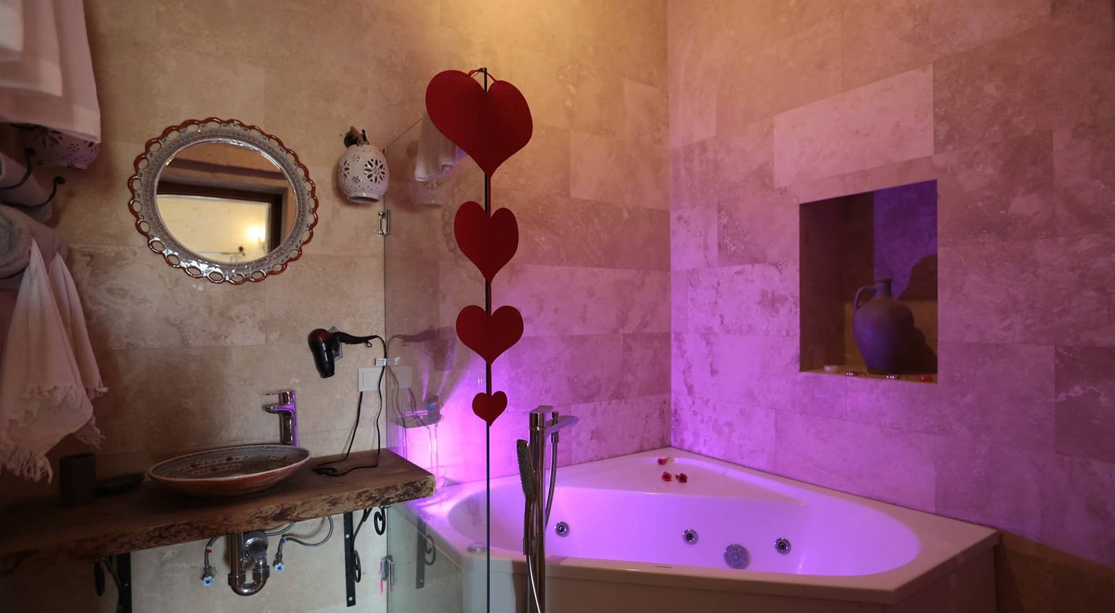 Our Spacious Restored Stone Room Comfort is a 21 m² retreat that preserves its original architectural charm while offering modern comforts. Overlooking Pigeon Valley and Mount Erciyes, the room features a terrace and an original stone seating area, perfect for enjoying the scenic views. Guests can also relax in the private jacuzzi. The bathroom includes a wide showerhead, separate shower, complimentary toiletries, bathrobe, towels, slippers, soap, and a hairdryer, ensuring a comfortable and rejuvenating stay.