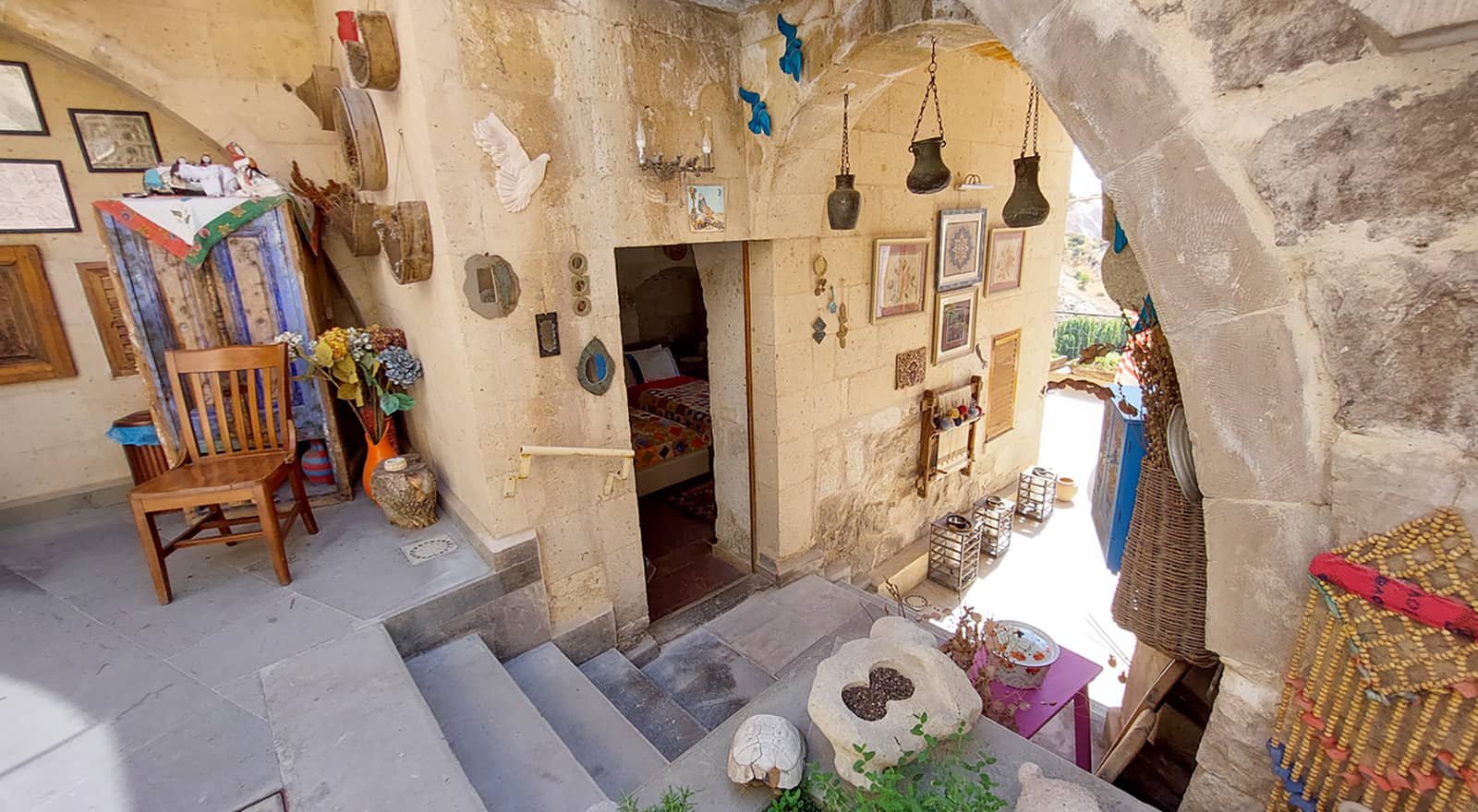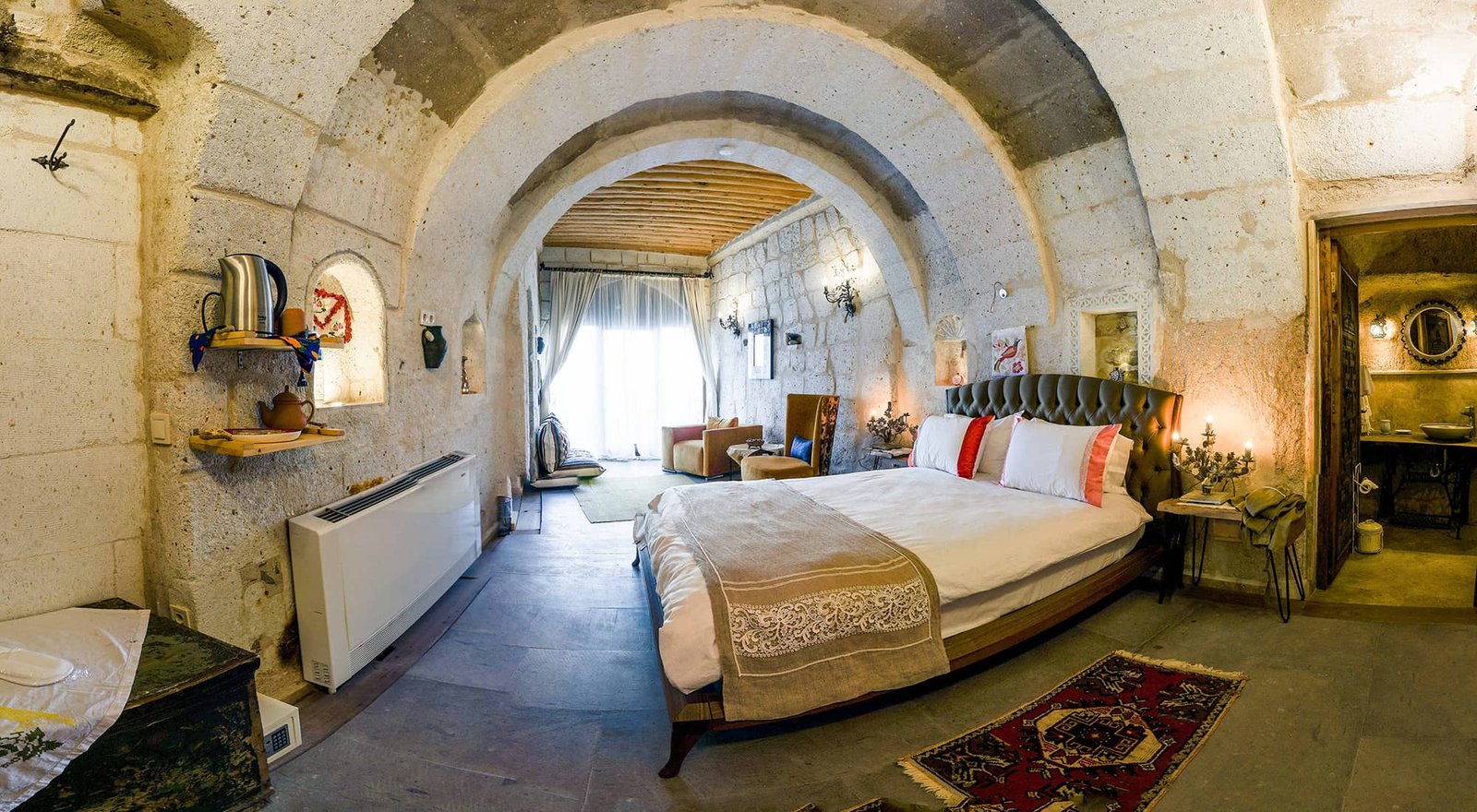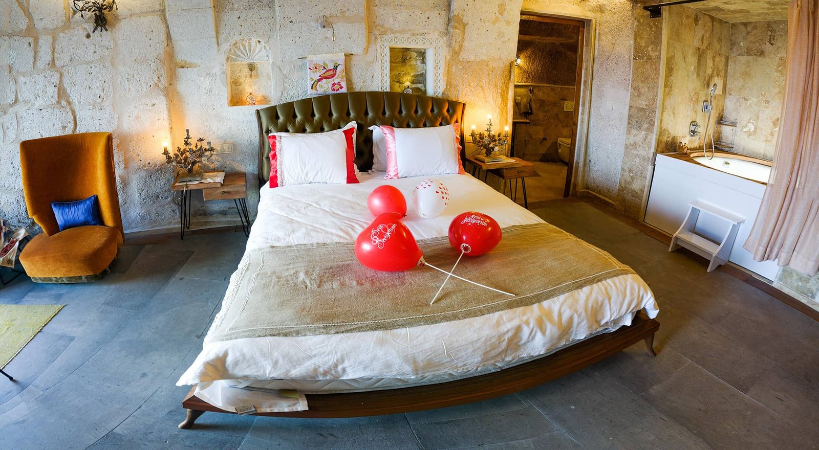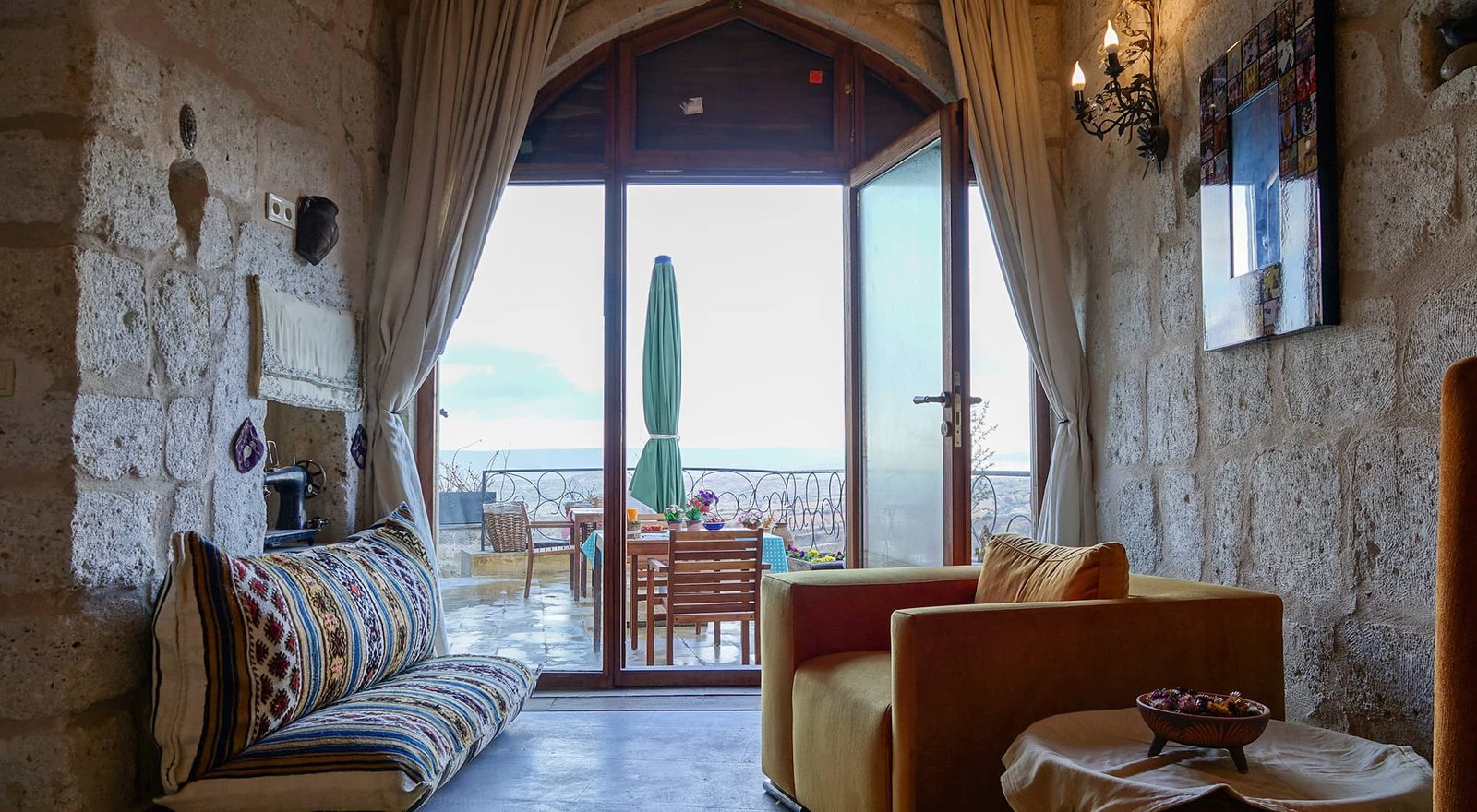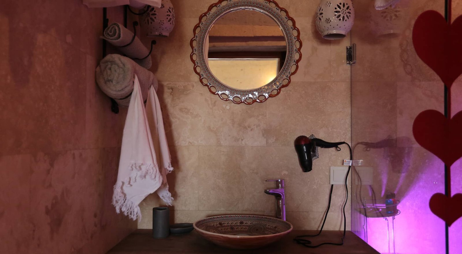 Our Spacious Restored Stone Room Comfort is a 21 m² retreat that preserves its original architectural charm while offering modern comforts. Overlooking Pigeon Valley and Mount Erciyes, the room features a terrace and an original stone seating area, perfect for enjoying the scenic views. Guests can also relax in the private jacuzzi. The bathroom includes a wide showerhead, separate shower, complimentary toiletries, bathrobe, towels, slippers, soap, and a hairdryer, ensuring a comfortable and rejuvenating stay.