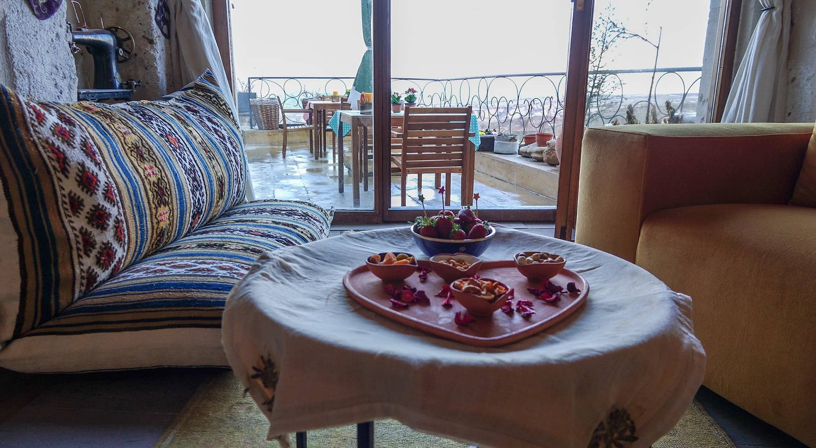 A cozy coffee spot by the arched window overlooks Mount Erciyes, and a second door opens directly onto a private terrace, offering a perfect setting for peaceful mornings or romantic evenings.