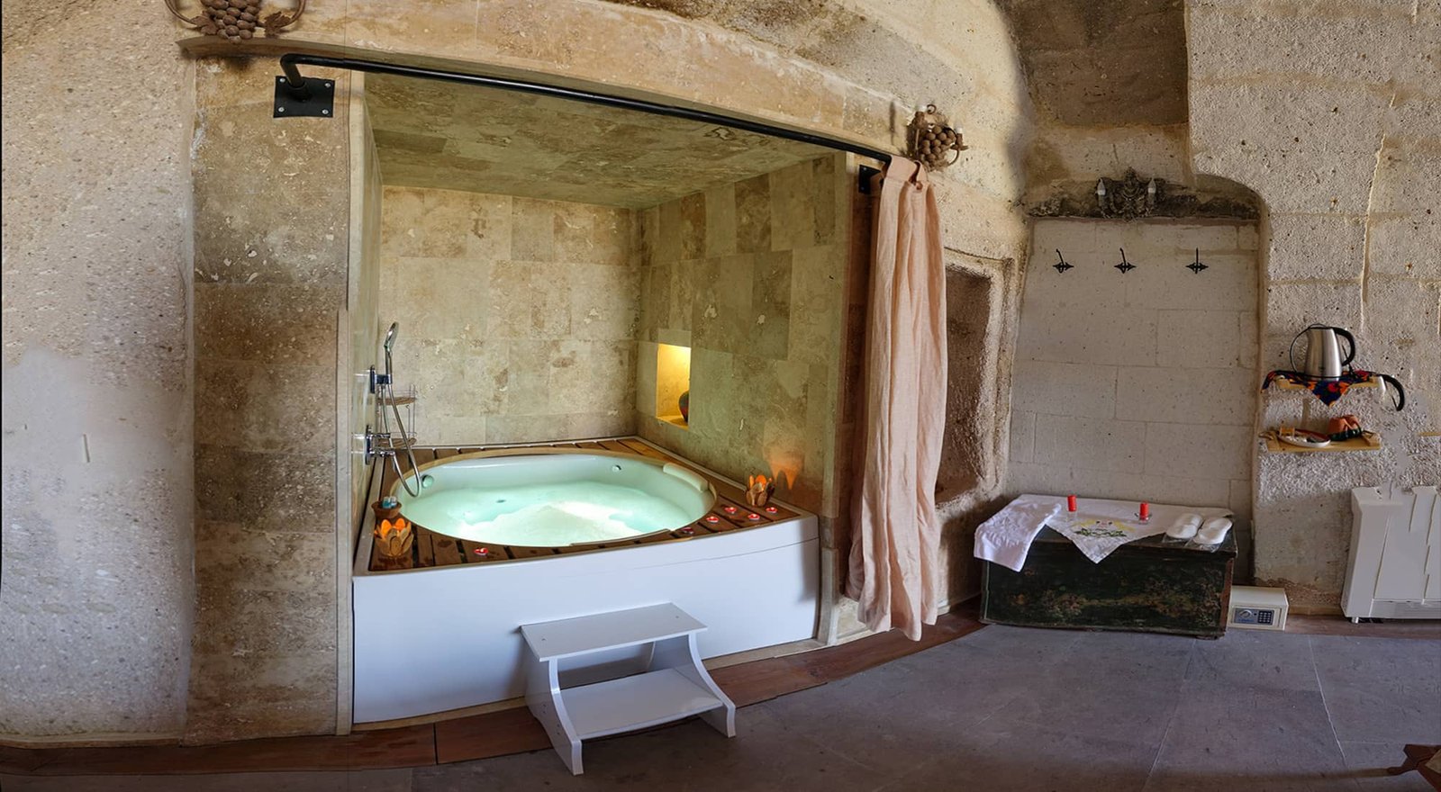 Our Arched Suite combines authentic stone architecture with modern luxury in a 32 m² space designed for both comfort and elegance. The room features a grand stone arch framing a panoramic view of Pigeon Valley, while a pool-style jacuzzi allows guests to relax and soak in the scenery.