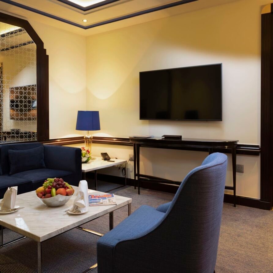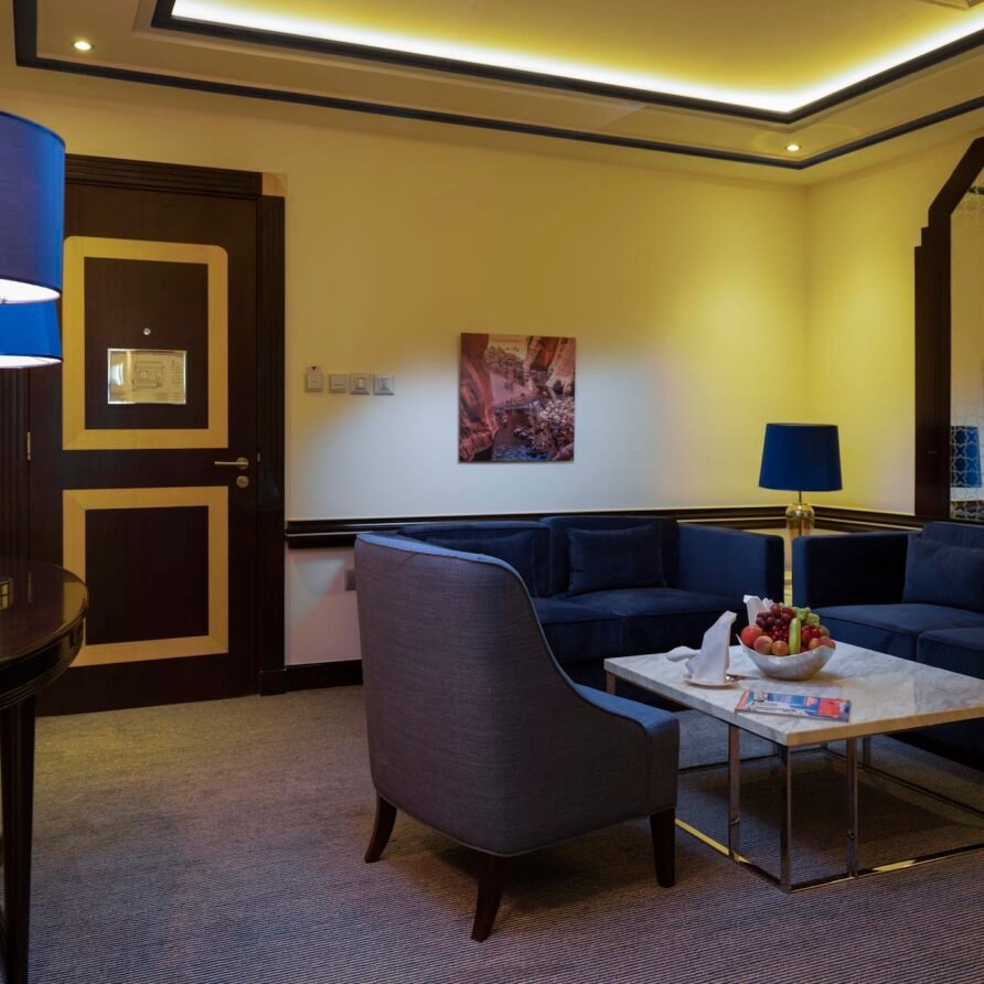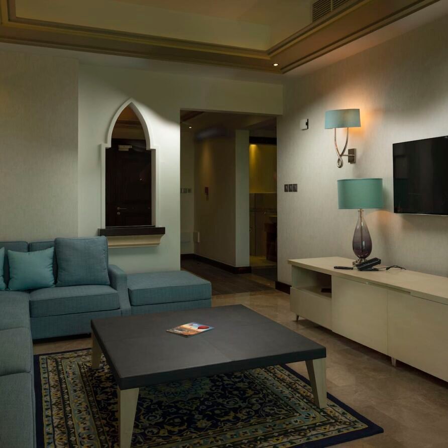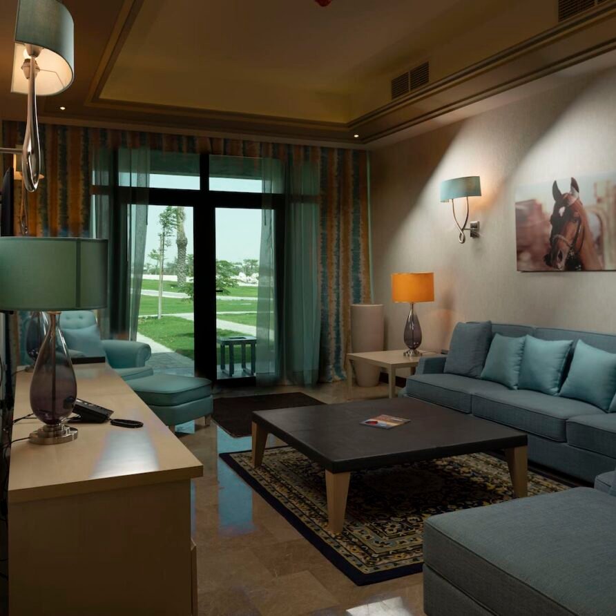 Relax in the Executive Suite at Retaj Salwa Resort & Spa, featuring a spacious bedroom, elegant living room, and luxurious amenities for a rejuvenating stay.