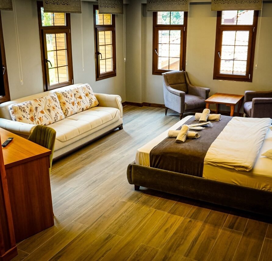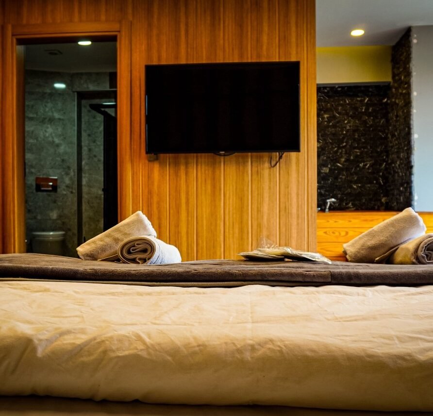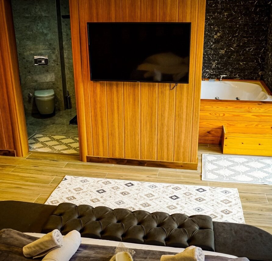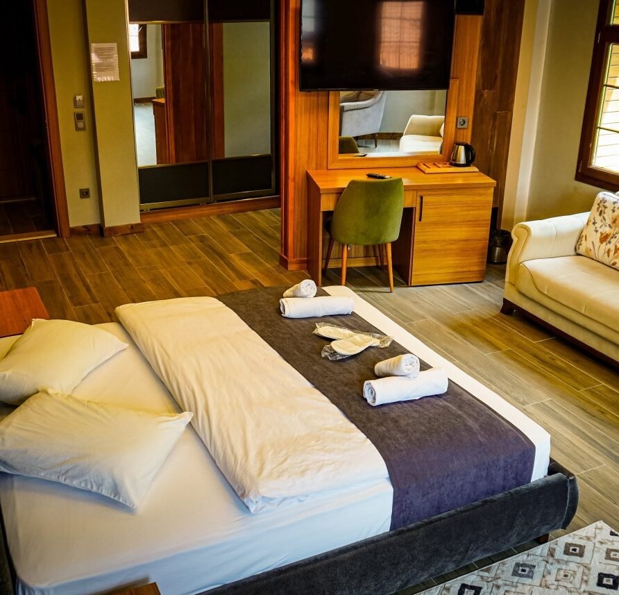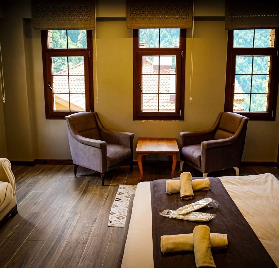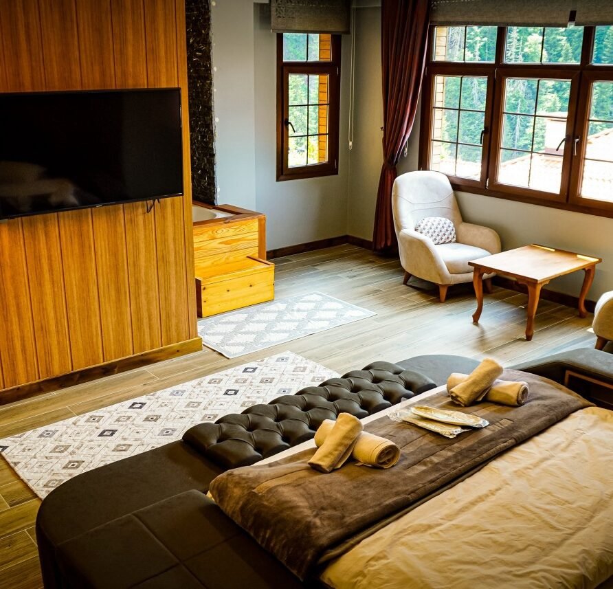 Our three-bedroom villas offer an enhanced sense of space and privacy, spanning 418 square meters and extending to a private yard with a large deck area and a 32-square-meter private pool. Perfect for gatherings with friends and family, each villa features beautiful landscape views from a fully furnished balcony, blending comfort, luxury, and natural beauty.